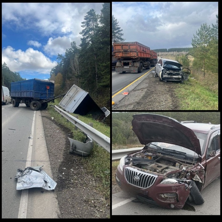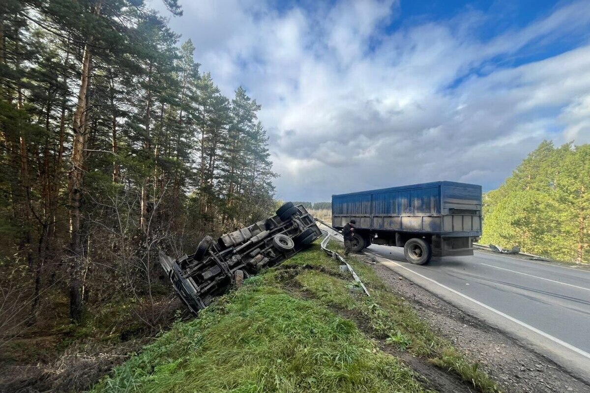 На кадрах с места происшествия видно, что на трассе столкнулось несколько автомобилей — две иномарки и большегруз с прицепом. На одной из фотографий видно, что прицеп остался на дороги фуры, а ее основная часть завалилась на бок и «сполза» в кювет, смяв под собой металлический отбойник.