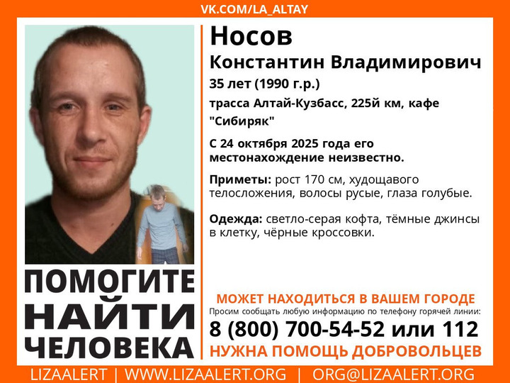 Как сообщили в поисковом отряде, местонахождение 35-летнего Носова Константина Владимировича остается неизвестным почти неделю, с 24 октября. Мужчину последний раз видели на 225 километре трассы «Алтай-Кузбасс», рядом с кафе «Сибиряк».