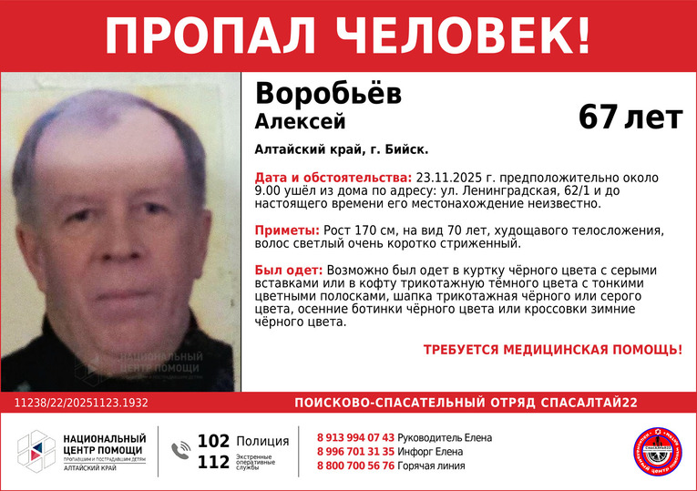 Как следует из ориентировки, 67-летний Воробьев Алексей ушел из дома на улице Ленинградской, 62/1 23 ноября предположительно около 09:00 и исчез. Его местонахождение неизвестно до сих пор. По данным ПСО, бийчанину нужна медицинская помощь.
