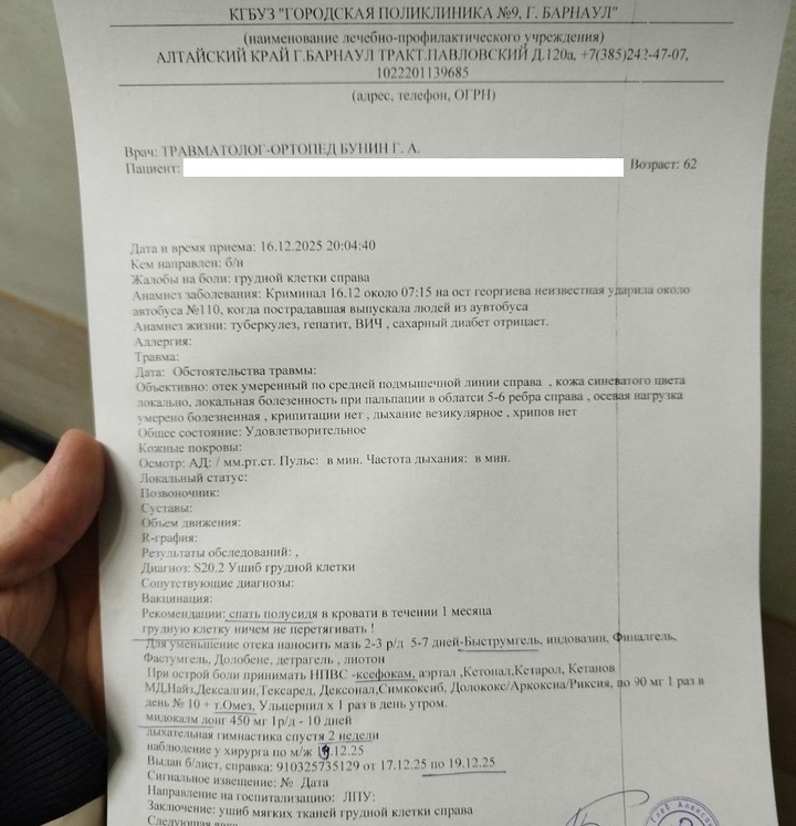 «Я попробовала прижаться к сиденьям, чтобы она смогла протиснуться к выходу, но разойтись в узком проходе мы не смогли, — вспоминает пострадавшая. — Тогда эта странная пассажирка стала ругаться еще сильнее. Я сказала, что выпущу ее на остановке. Далее я и несколько пассажиров вышли из автобуса на остановке «Георгиева», выпуская остальных. Дождавшись, пока желающие выйдут, в том числе эта женщина, я стала обратно подниматься в салон по ступенькам. В этот момент я почувствовала два сильных удара в правый бок. Меня пронзила боль, в шоке я обернулась и увидела эту старушку, которая била меня тростью и кричала «убью, сука». Прежде, чем я что-либо сообразила, двери автобуса закрылись и мы поехали дальше».