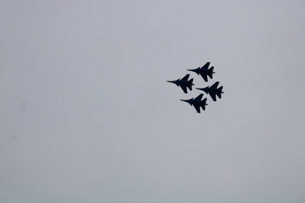 Над городом пронеслись истребители Су-35С — машины, сочетающие в себе невероятную маневренность и мощь. На протяжении 20 минут пилоты демонстрировали мастерство высшего класса: с идеальной синхронностью выполняя бочки, групповые петли, стремительные пикирования и сложнейшие развороты. Каждый элемент программы подчёркивал не только технические возможности самолётов, но и исключительную слаженность экипажей.