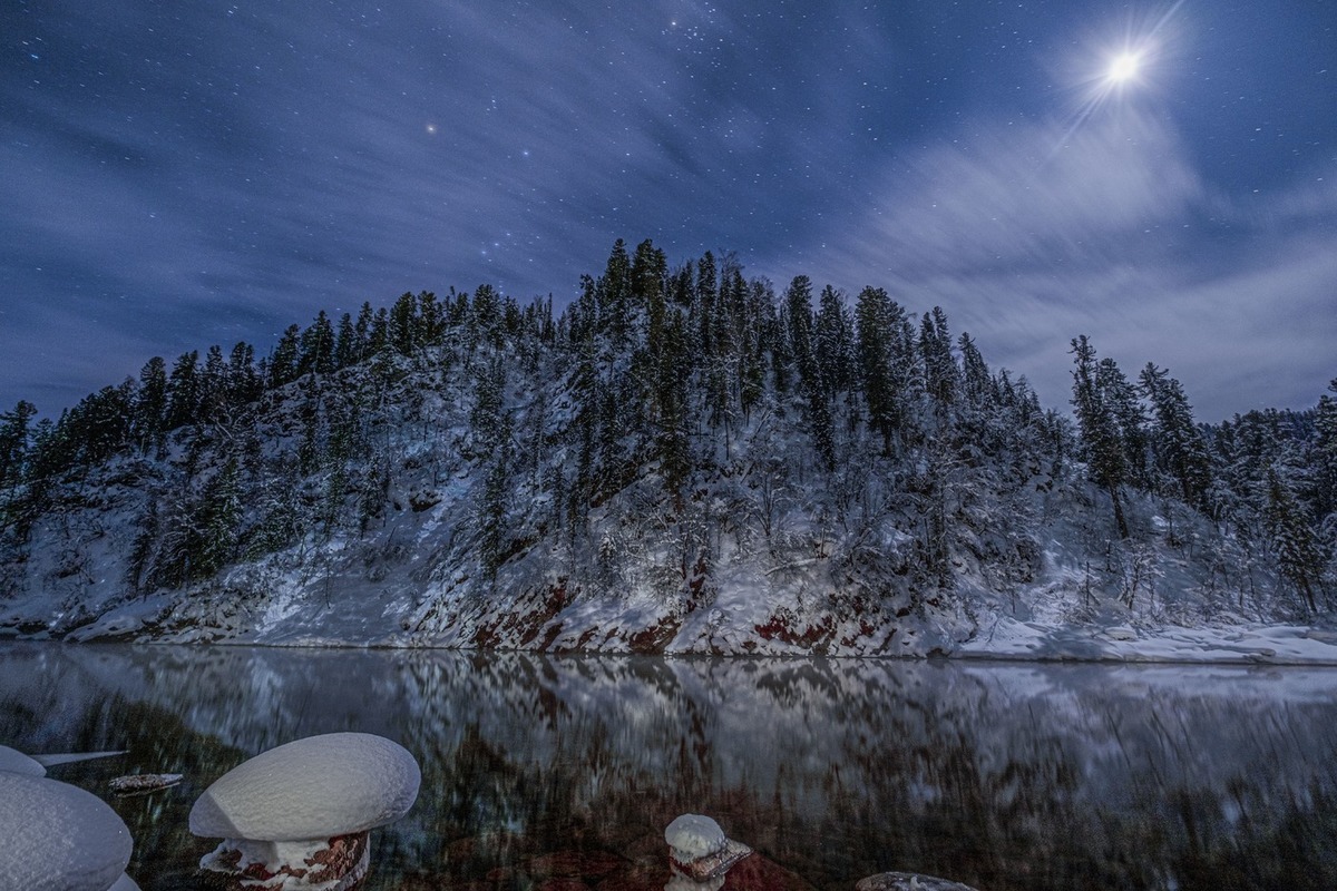 «Бронзу» фотографу принес снимок, на котором запечатлен великолепный ночной вид на реке Бия: темная гладь воды, снежные холмы, вековые кедры и яркое свечение созвездия Большой медведицы в небе. Композиция фото передает не только мощь российской природы, но и величие космоса.