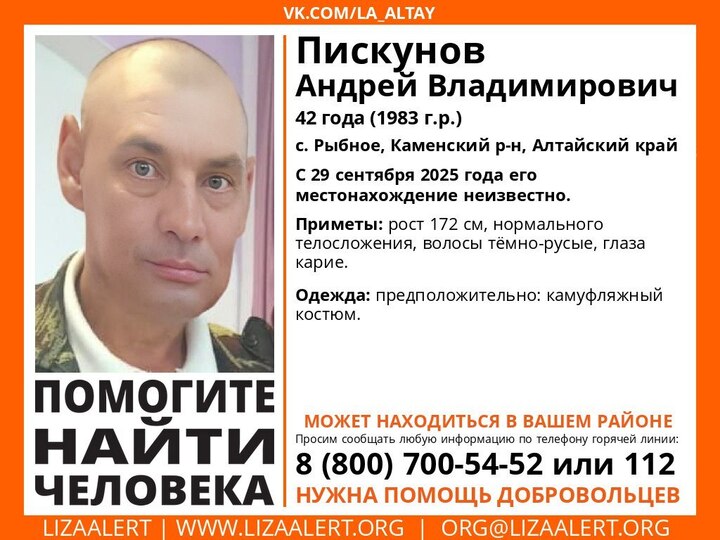 По данным поискового отряда «ЛизаАлерт», 42-летний Пискунов Андрей Владимирович исчез в селе Рыбном. Его не могут найти с 29 сентября.
