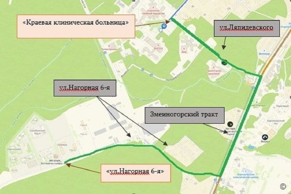 - В обратном направлении: 6-я Нагорная — Змеиногорский тракт — Ляпидевского — далее по маршруту.
