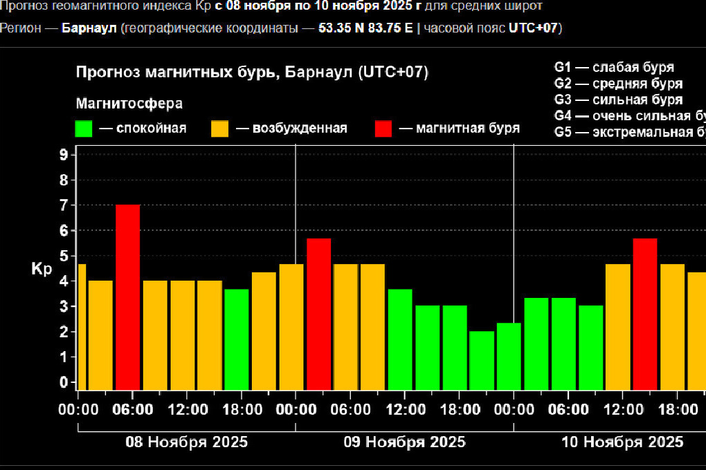 Согласно данным Лаборатории солнечной астрономии ИКИ и ИСЗФ, магнитная буря уровня G3 ударила по Алтайскому краю около 6:00 часов утра 8 ноября. Спустя несколько часов она прекратилась, однако в течение дня магнитосфера будет неспокойной. По прогнозам ученых, следующая магнитная буря ожидается уже в ночь на 9 ноября, а после - днем 10 ноября.