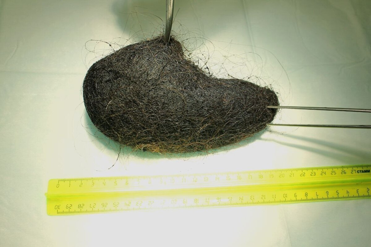 «Такой случай встречаю впервые за 25 лет практики, — рассказала заведующая отделением Нина Мамонтова. — Комок волос был очень плотный, как валенок. Разделить его на части было невозможно. Скорее всего, волосы частично проходили по пищеварительному тракту, но в какой-то момент намотались на пищевой комок и слиплись в плотную массу».