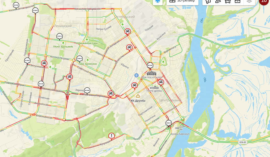 По данным онлайн-карт, автомобили стоят на площади Октября, на проспекте Ленина, Комсомольском и Красноармейском проспектах, а также на улице Молодежной. Сложная ситуация сохраняется и на улице Мамонтова. Заторы образовались на обеих полосах Змеиногорского тракта. Водителям также рекомендуется избегать участка дороги в районе улицы Кутузова.